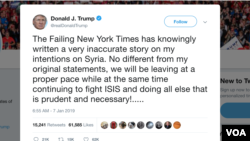 Në një koment në Twitter të hënën, Presidenti Trump nuk caktoi ndonjë afat kohor për tërheqjen dhe foli me sarkazëm për atë që ai e cilësoi si "një një lajm shumë të pasaktë" në gazetën "New York Times", ku thuhej se zoti Trump po hiqte dorë nga deklarata e tij e 19 dhjetorit për një tërheqje të shpejtë të shpejtë të trupave, që zyrtarët thanë se do të kërkonte rreth 30 ditë.